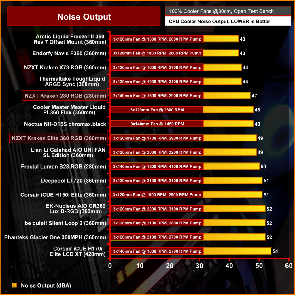 With the fans running at maximum RPM the Kraken Elite 360 isn’t the loudest cooler but at 49dBA the noise is very noticeable over ambient noise, with two fans running at lower RPM the Kraken 280 is 2dBA quieter which doesn’t sound like much but there’s quite a difference in noise output between the two coolers.