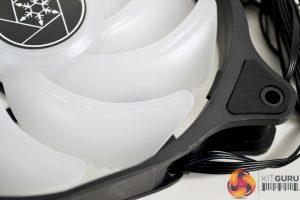 Additionally, there are two 120mm ARGB fans with 4-pin PWM connectivity, featuring nine opaque blades on a relatively small central hub. The four corner mounting points are fitted with rubber anti-vibration pads and feature standard ARGB 3-pin 5v connections.