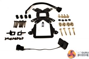 Once removed from the box and plastic wrapping, we can clearly see what’s included. Several grip seal bags contain all the mounting hardware which is sorted for socket type. Another grip seal bag contains assorted cables and an ARGB controller and of course, the cooler itself.