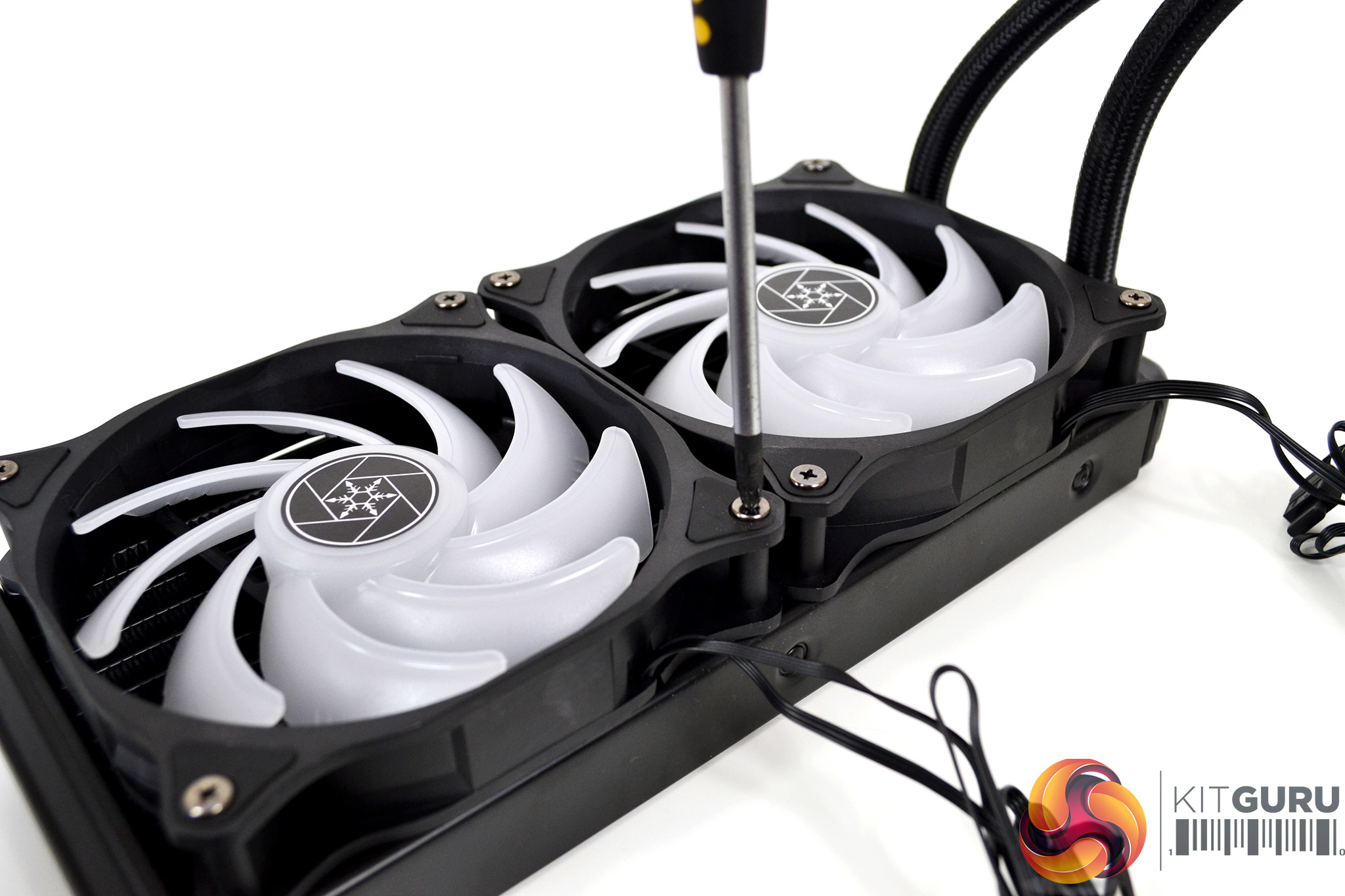 Next, fit the fans to the radiator. Place the fans over the radiator with the mounting holes in both components lined up and install the eight long Philips head screws provided. Tighten the screws down with a screwdriver.