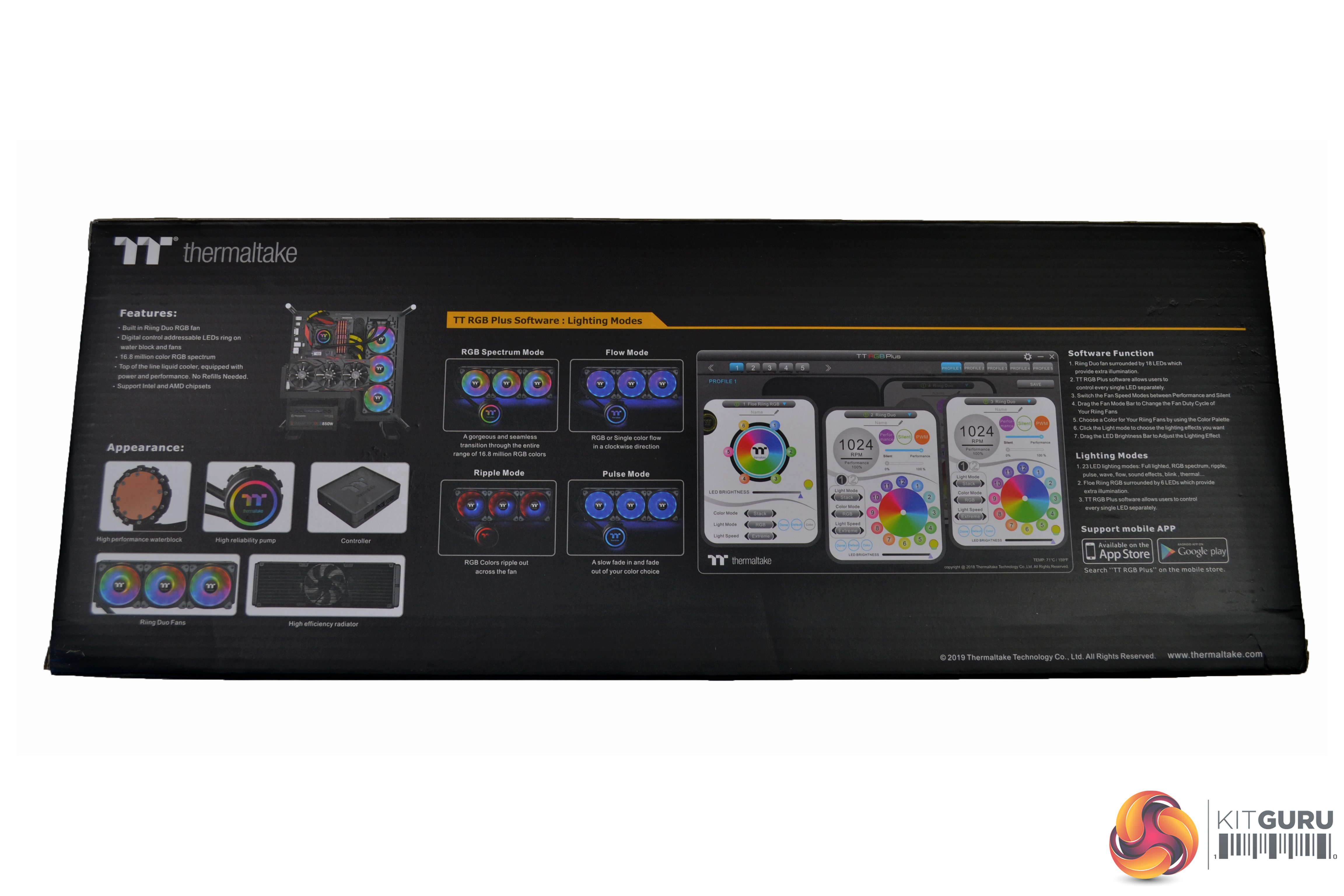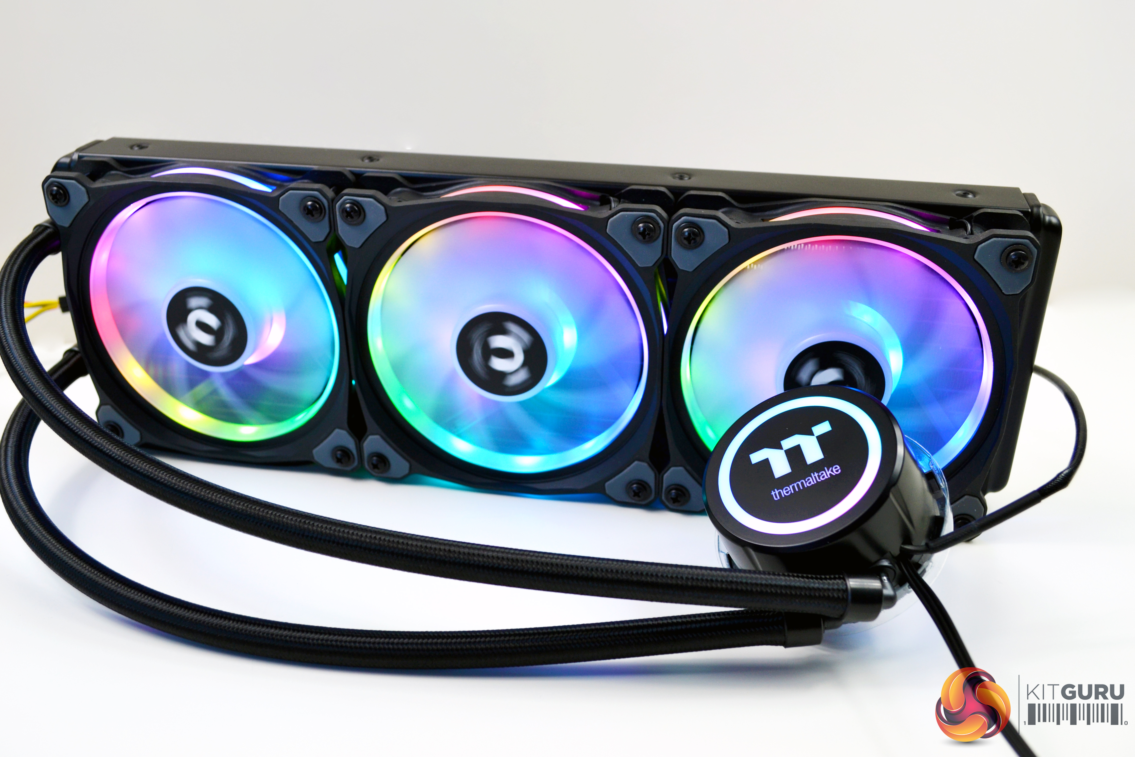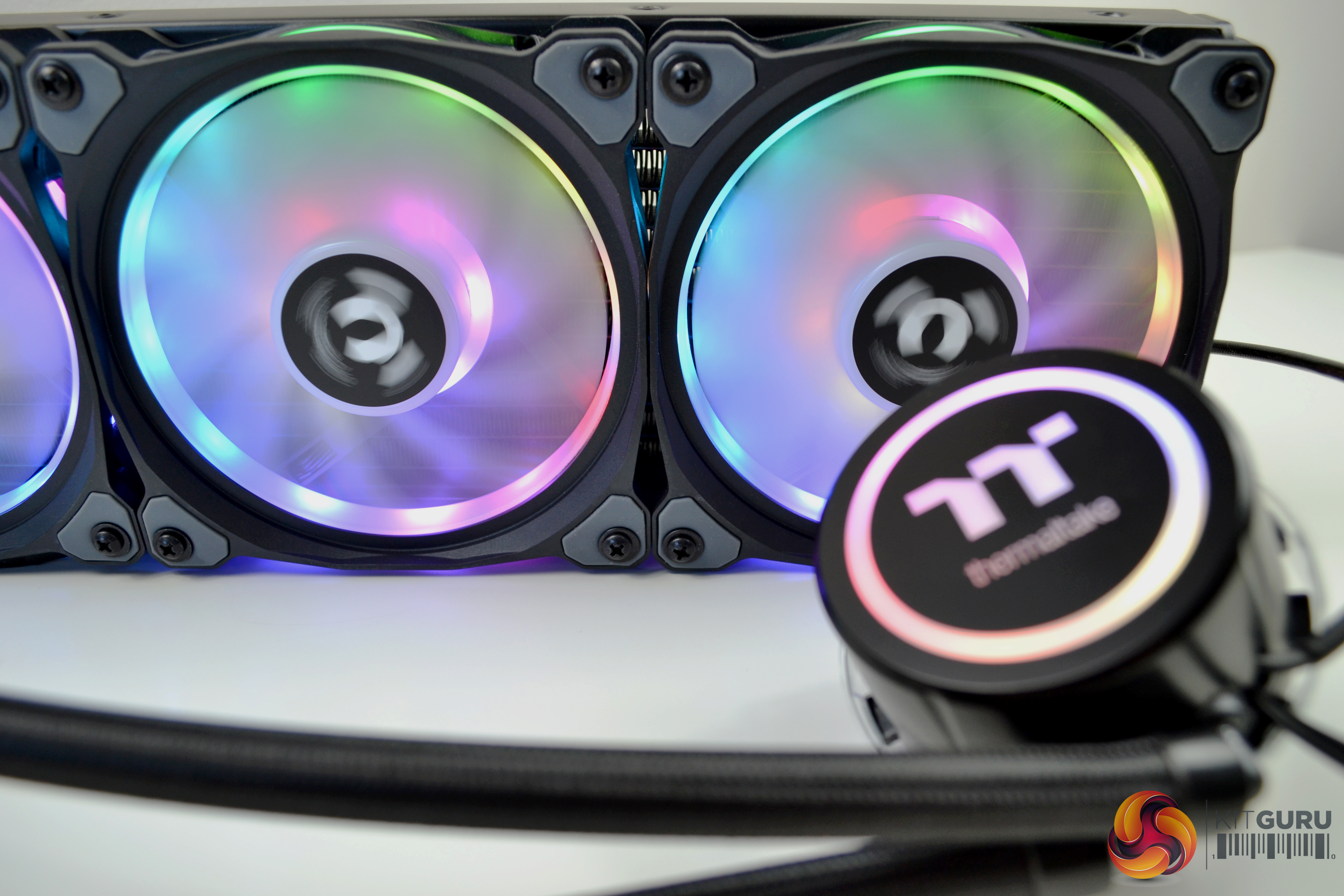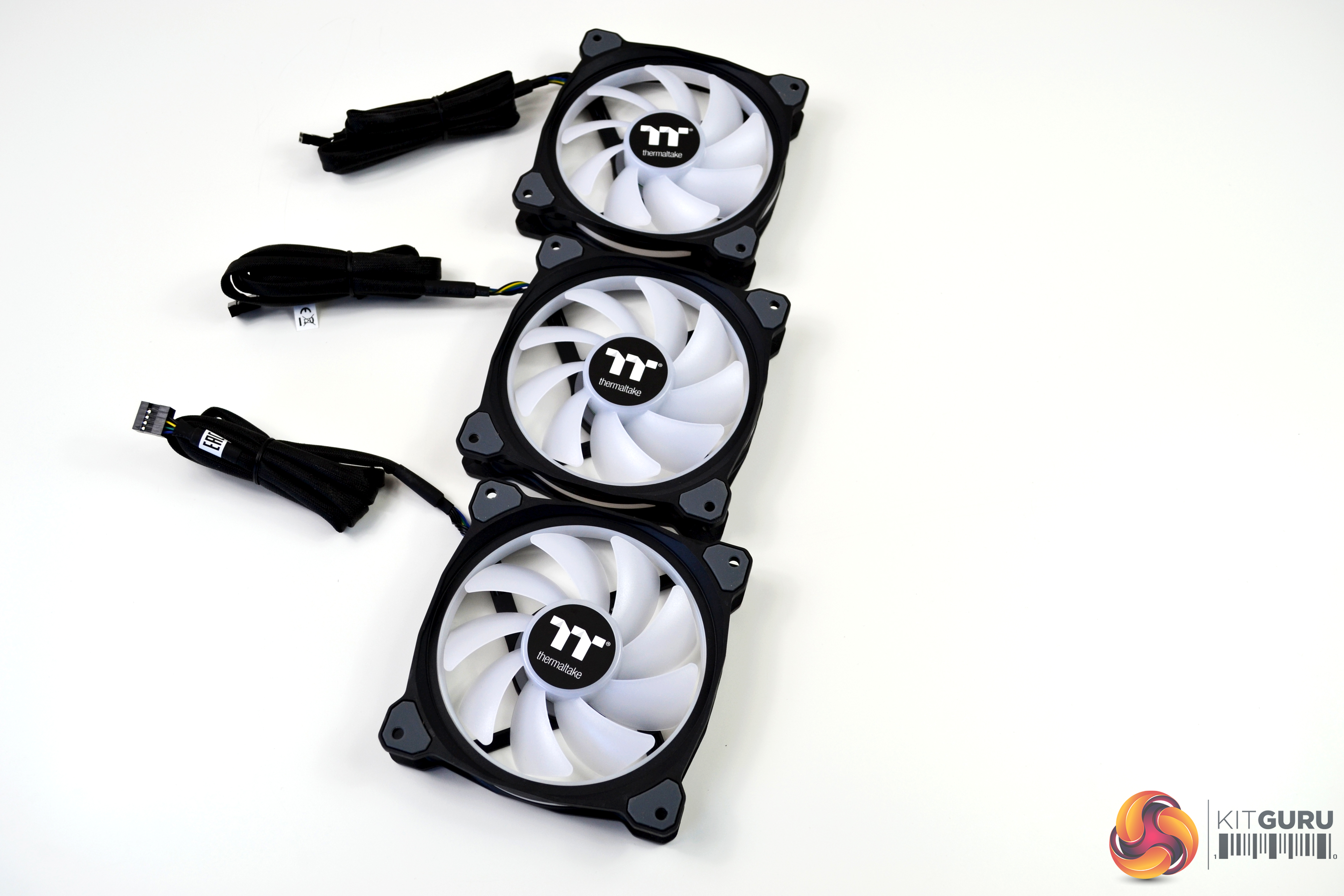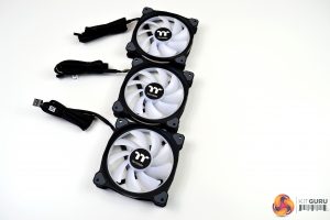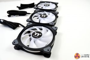 The three Ring Duo fans included are high static pressure, which look very clean even without the lighting on. There is some visually pleasing angular shaping to the four corners of the fans and around the mounting holes, there are anti vibration, noise dampening rubber pads. However, the fan cables have a proprietary connection, so cannot be installed on a standard three or four pin motherboard header and must be connected to the Thermaltake RGB control module included. The cables connected to the fans measure a huge 920mm in length.