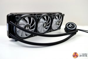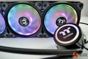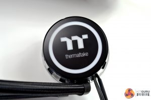 Looking at the CPU block/pump, it seems to be accurately machined and manufactured from high quality copper. The pump, which is rated at 12V 3600RPM, is contained in a black plastic housing, which has an RGB ring around the perimeter and the Thermaltake logo in the centre is also a RGB zone. Thermaltake state that “Combined with a copper base plate and a reliable pump, the Floe DX series provides high performance and unparalleled heat dissipation”. After carrying out our tests, we will find out how good the performance actually is.
