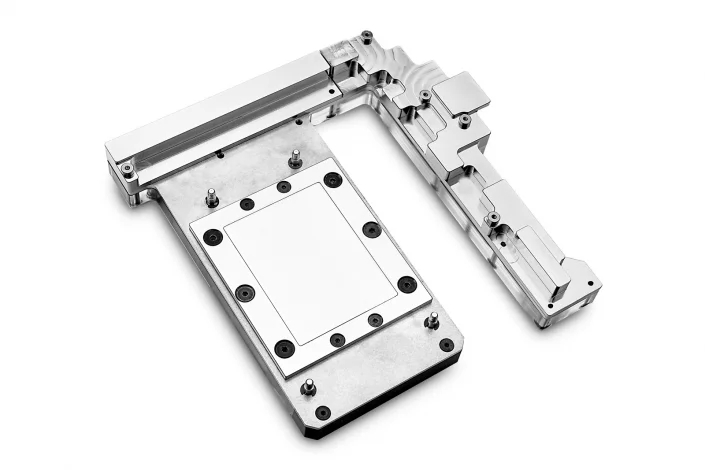 EK Water Blocks also states the mounting screws and brass screw-in standoffs for the block are nickel-plated and are pre-installed, making the installation process easier. Being a “true one-piece” monoblock, there are only two connector fittings, with the bottom left out port being strategically placed to make tube routing that bit easier.