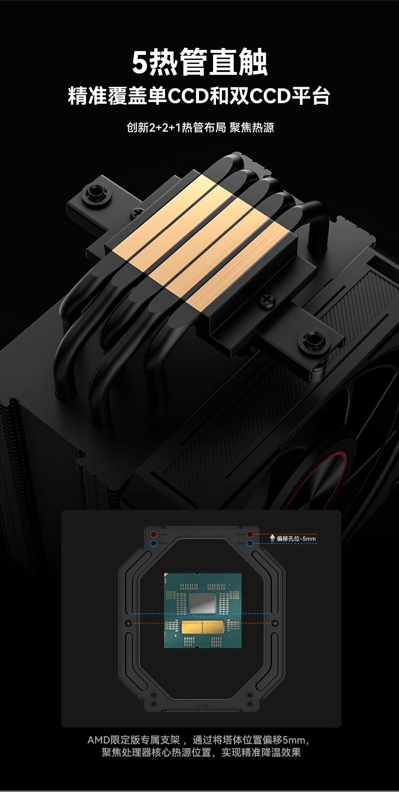 According to ITHome (via Guru3D), the heatsink itself features folded and clipped fin-edge finishing. Heat is transferred via five direct-touch heat pipes arranged in a unique 2+2+1 pattern. Interestingly, ID-Cooling has tuned this layout specifically to align with the decentralised hotspots of modern chiplet-based CPUs. The AMD Limited Edition takes this optimisation a step further by including a 5mm offset mounting bracket designed to centre the heat pipes directly over the compute dies of Ryzen processors. This version features red visual accents and is only supported by AMD platforms, whereas the all-black standard model supports both Intel and AMD sockets.