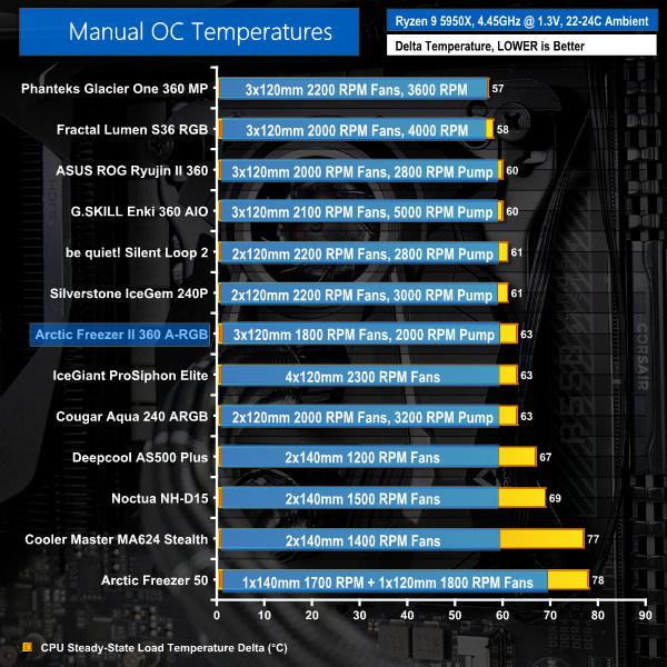 We won’t be too harsh in this respect as the balance between noise and performance does look to be incredibly strong. But with a 63C delta in our testing, the 360mm Arctic AIO is behind the curve for competing 360mm and even higher end 240mm AIOs.