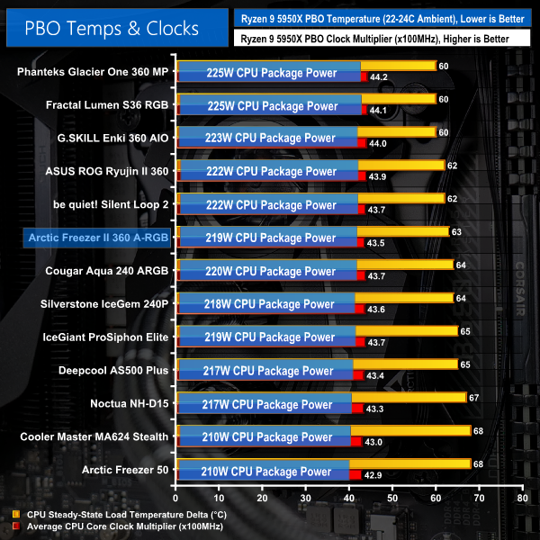 We see the CPU temperature reading on our Ryzen 9 5950X coming in below the 90C limit. And the resultant CPU average core clock is around 4.35GHz. This is a little lower than some competing AIOs and is notably behind the other 360mm units. But it is still a reasonable outcome when coupled with the 219W of managed package power.