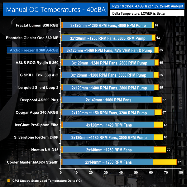 And this is where the Liquid Freezer II 360 A-RGB cooler starts to shine. Despite being locked at 40dBA, the Arctic cooler was able to maintain 75% of its original components’ PWM running speeds. This meant that the drop-off in cooling performance was far less significant than for some of the other – louder – AIOs.