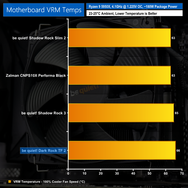 Perhaps unsurprisingly given that the cooler and power delivery solution were tasked with an extra 10W of power delivery to the CPU, VRM temperature results are not particularly impressive from the Dark Rock TF 2 either.