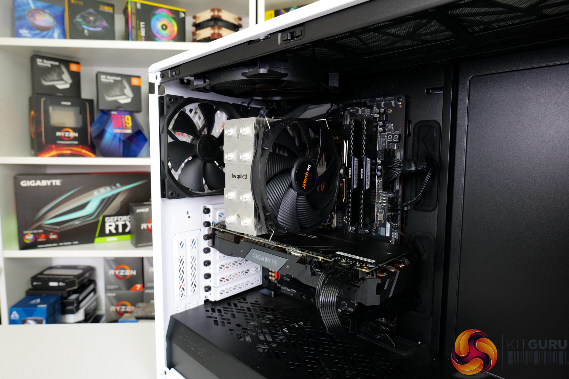 The fan configuration is the three included Fractal Dynamic X2 GP-14 fans spinning at full 1000 RPM speed. In addition to the two 140mm front-mounted fans, and single 140mm rear exhaust, we added a be quiet! Pure Wings 2 1000 RPM 140mm fan as roof exhaust for air cooler testing. The aim here was to keep consistency with the airflow path of the liquid coolers which are always roof mounted.