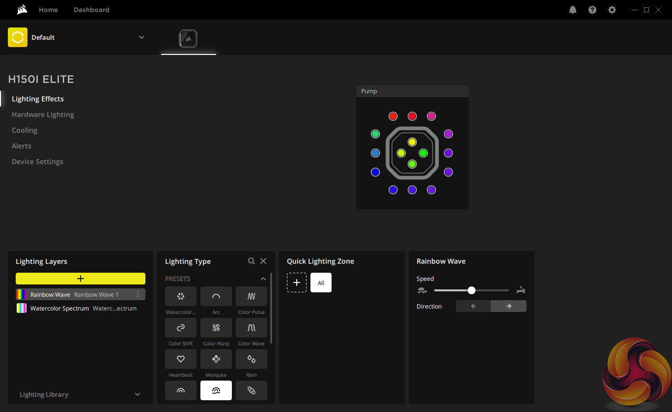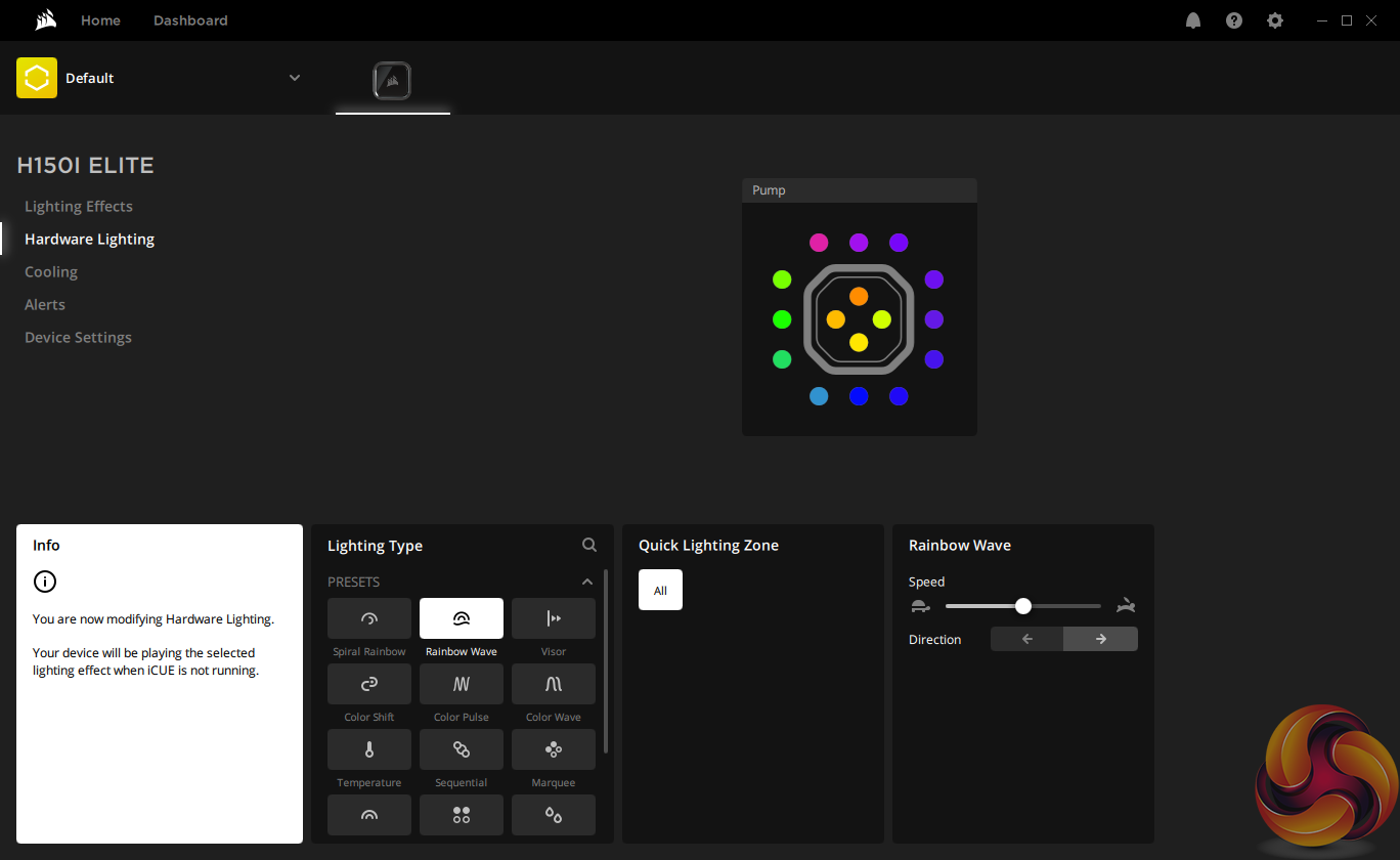 You can mess with the various RGB lighting options for the pump housing – including synchronisation with other Corsair components such as memory. And Hardware Lighting for prior to iCUE initialisation such as during system boot.