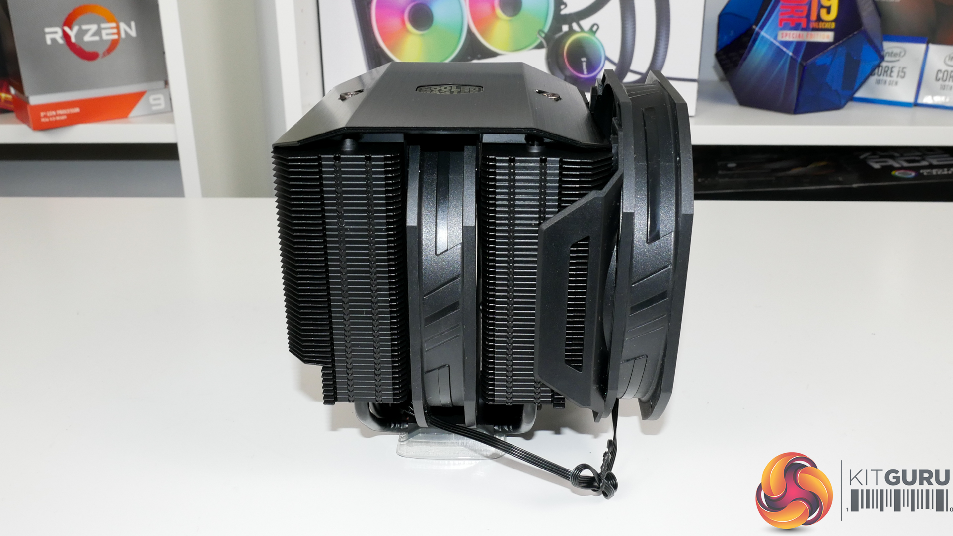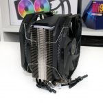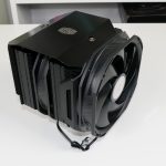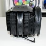 Six heatpipes exit the nickel-plated base and feed into the dual aluminium fin arrays. The two fans we would consider to be main are 140mm SickleFlow versions with 650-1400 RPM rated PWM speeds. At 1400 RPM top speed, Cooler Master looks to be gunning for low-noise operation. Cooler Master includes a third fan – a 120mm SickleFlow blower with 650-1800 RPM rated PWM speed. This is intended for use with over-sized RAM modules.