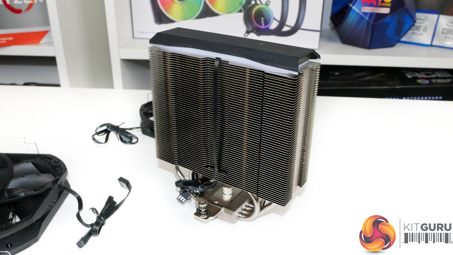 A strip of A-RGB LED lighting is mounted around the black plastic shroud atop the fin stack. The LED lighting is controlled via the usual motherboard methods or via a bundled in-line controller. Worth noting is that the shroud marks quickly, as shown by our remnant grey thermal paste that cannot be cleaned off easily.
