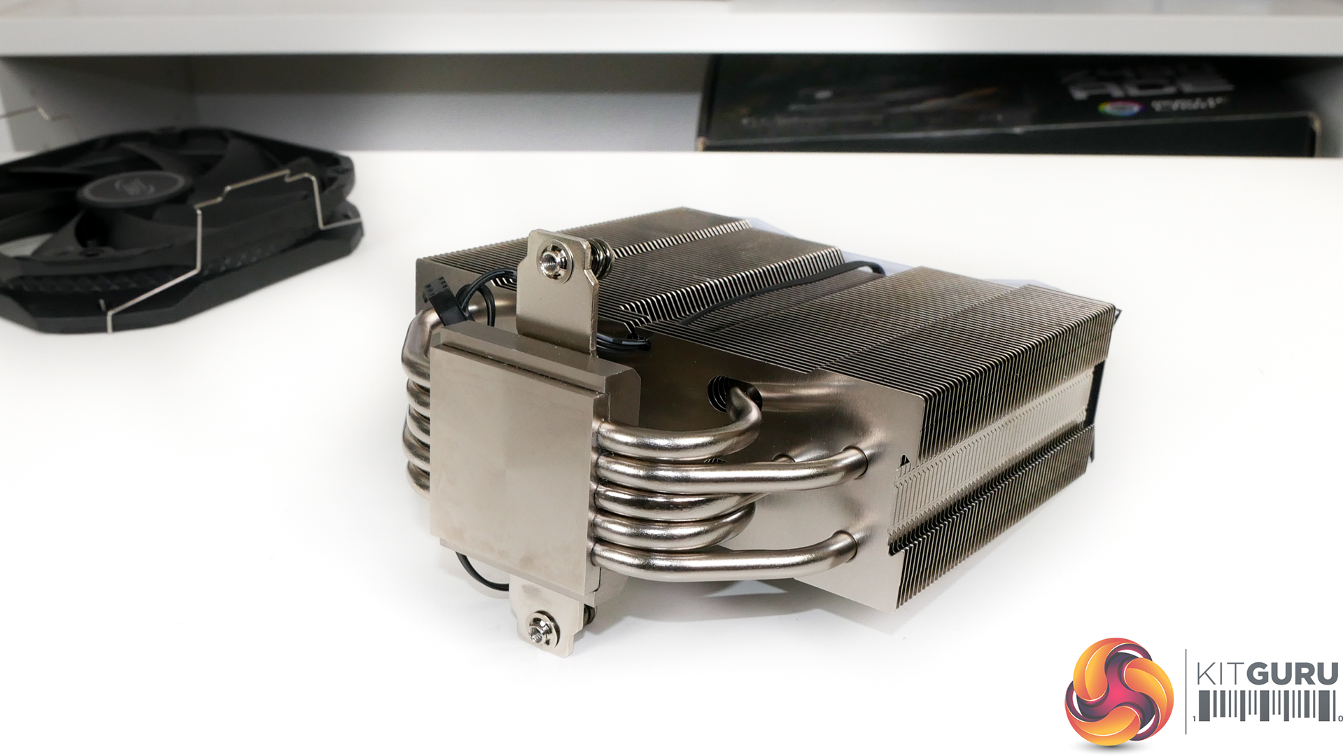 A nickel-plated copper base feeds into five 6mm heatpipes. The heatpipes are mounted in a U-type configuration through the fairly densely packed aluminium fin array. One of the key features that DeepCool highlights is the AS500 Plus cooler’s slim overall profile that makes it ideal for use with tall memory modules.