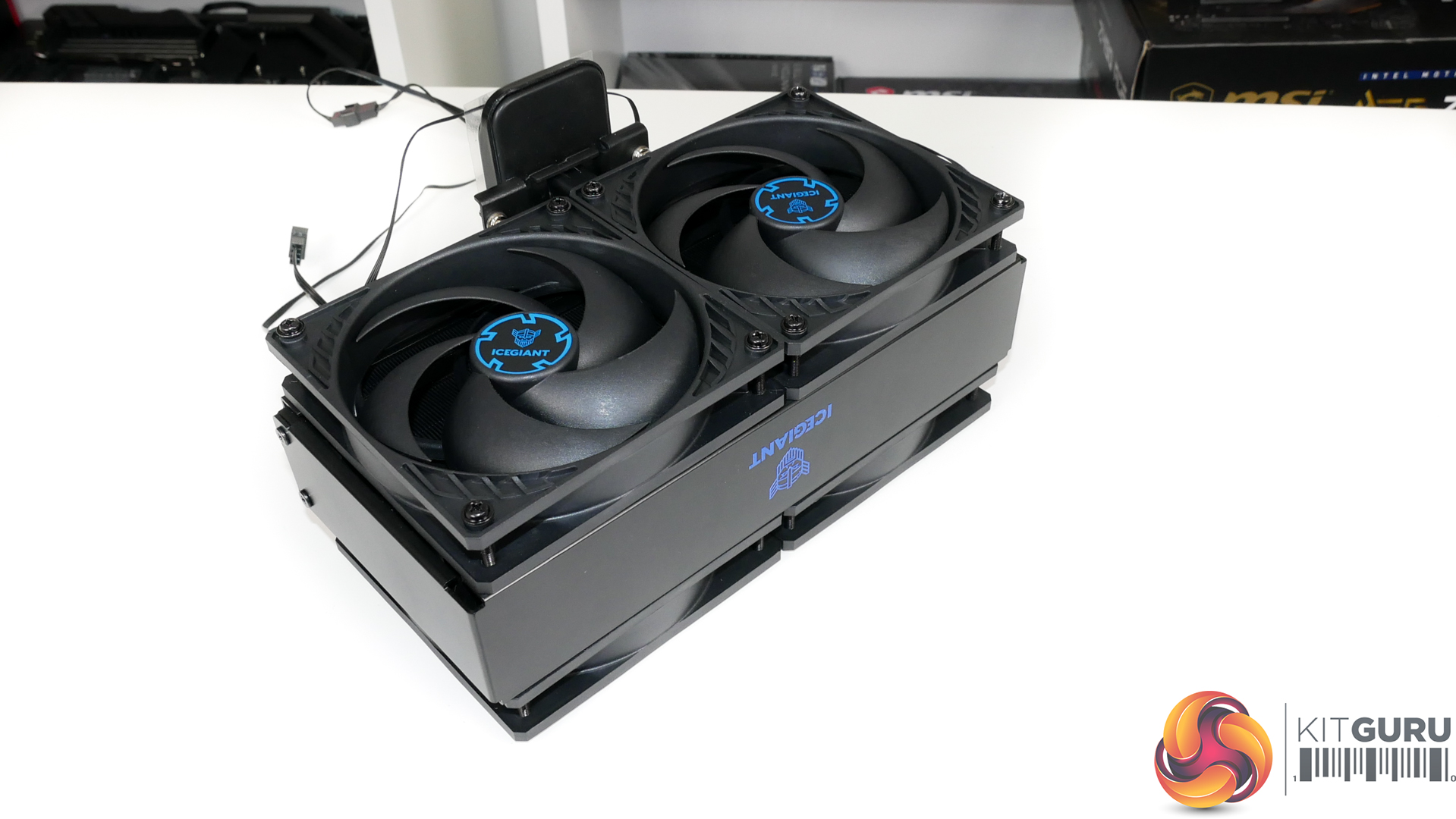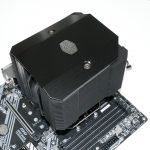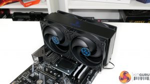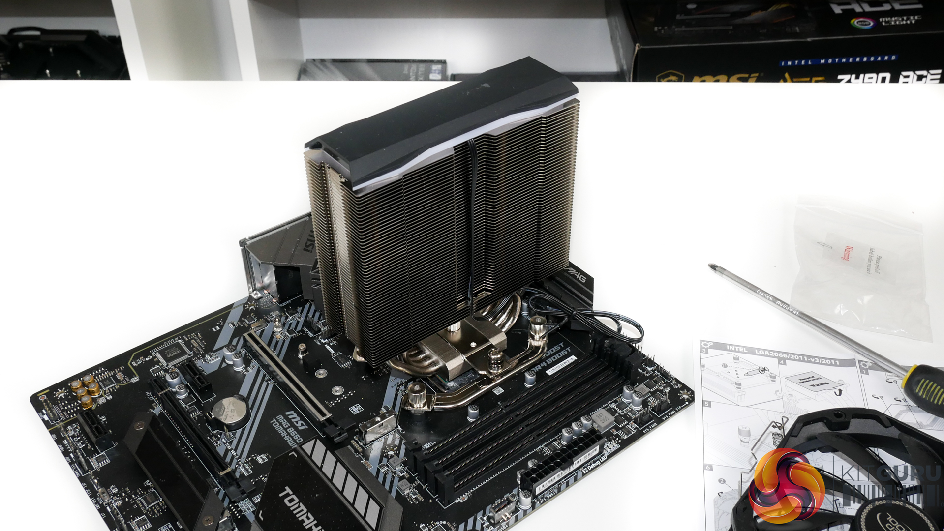 The cooler in its single-fan mode is then placed onto the CPU and secured by tightening the two protruding top-side screws. This final parts of the heatsink installation is very good as the central fan does not need removal.