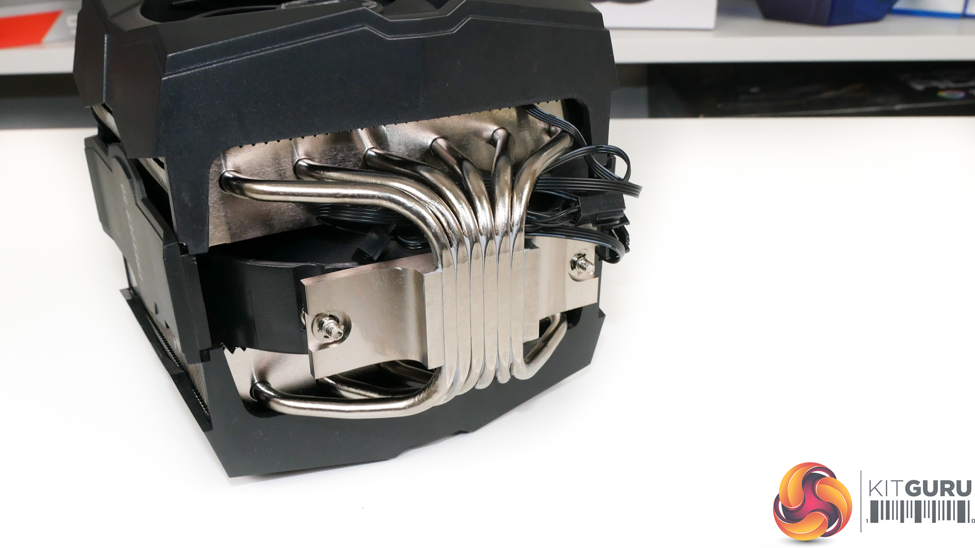 Importantly, thermosiphon cooling technology is used to transfer heat away from the aluminium evaporator (baseplate/cold plate, if you like). The thermal energy boils the internal fluid, the vapour from which travels through the three condensers and dumps its heat off to the fin array, the vapour is then condensed back into liquid and is gravity-fed back down to the evaporator to complete the continuous cycle.