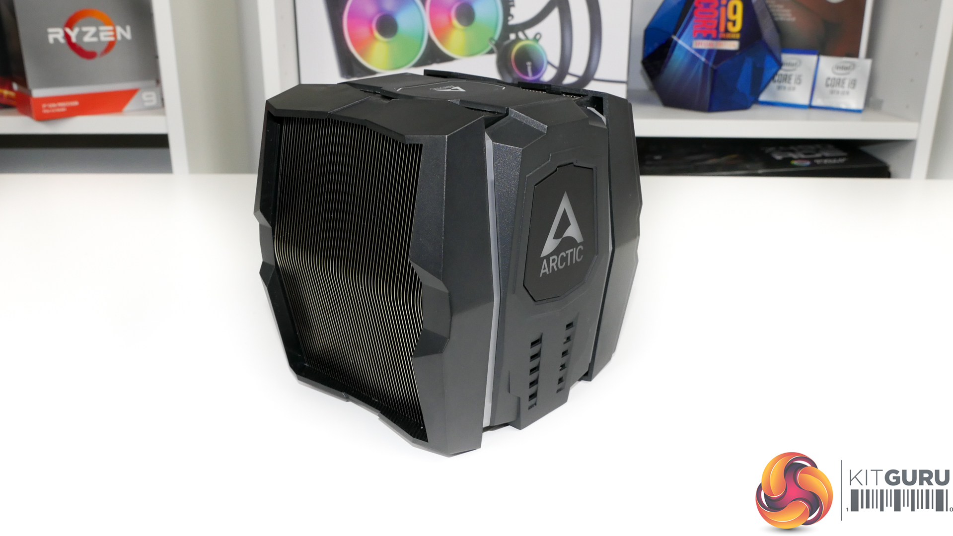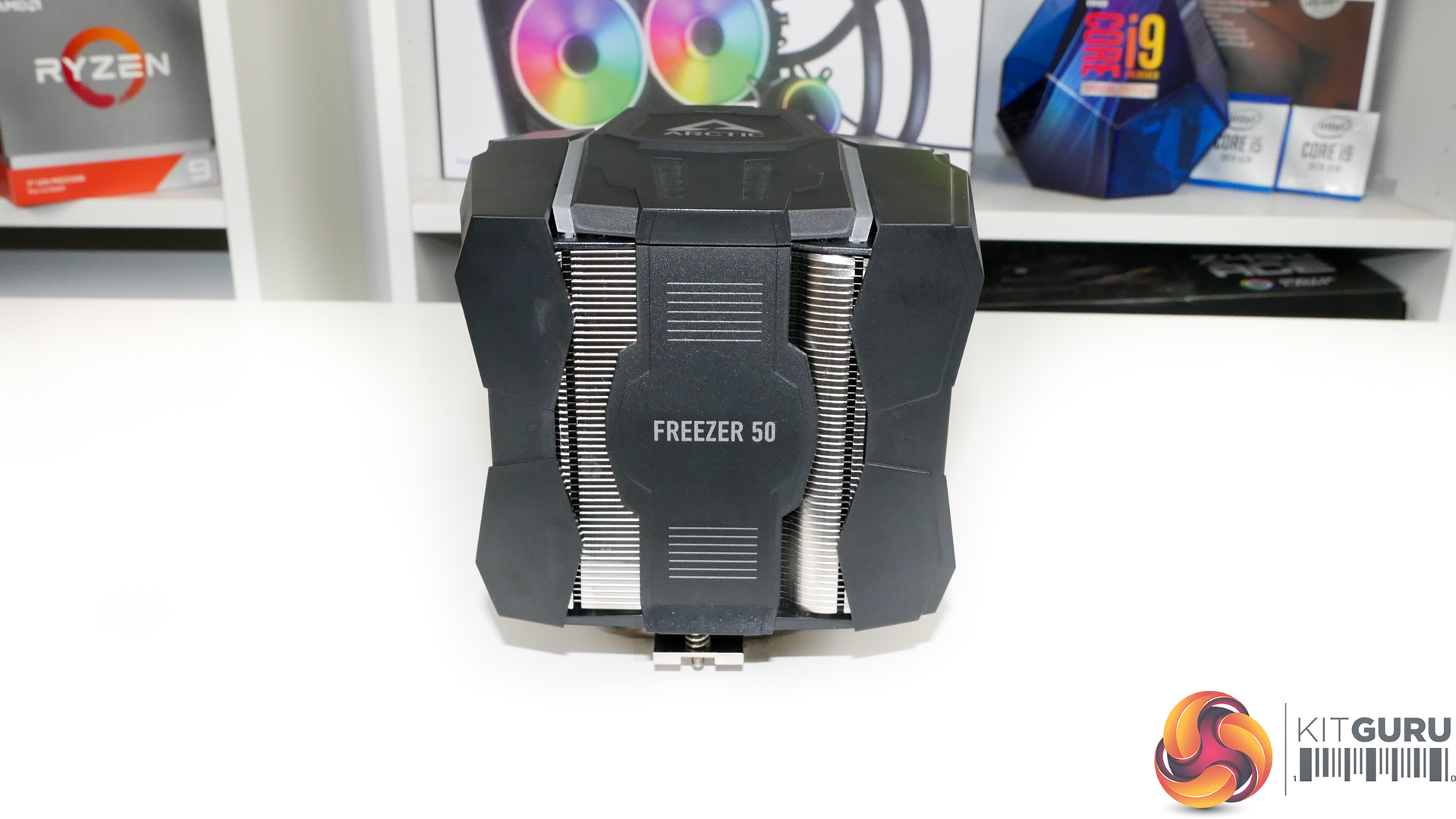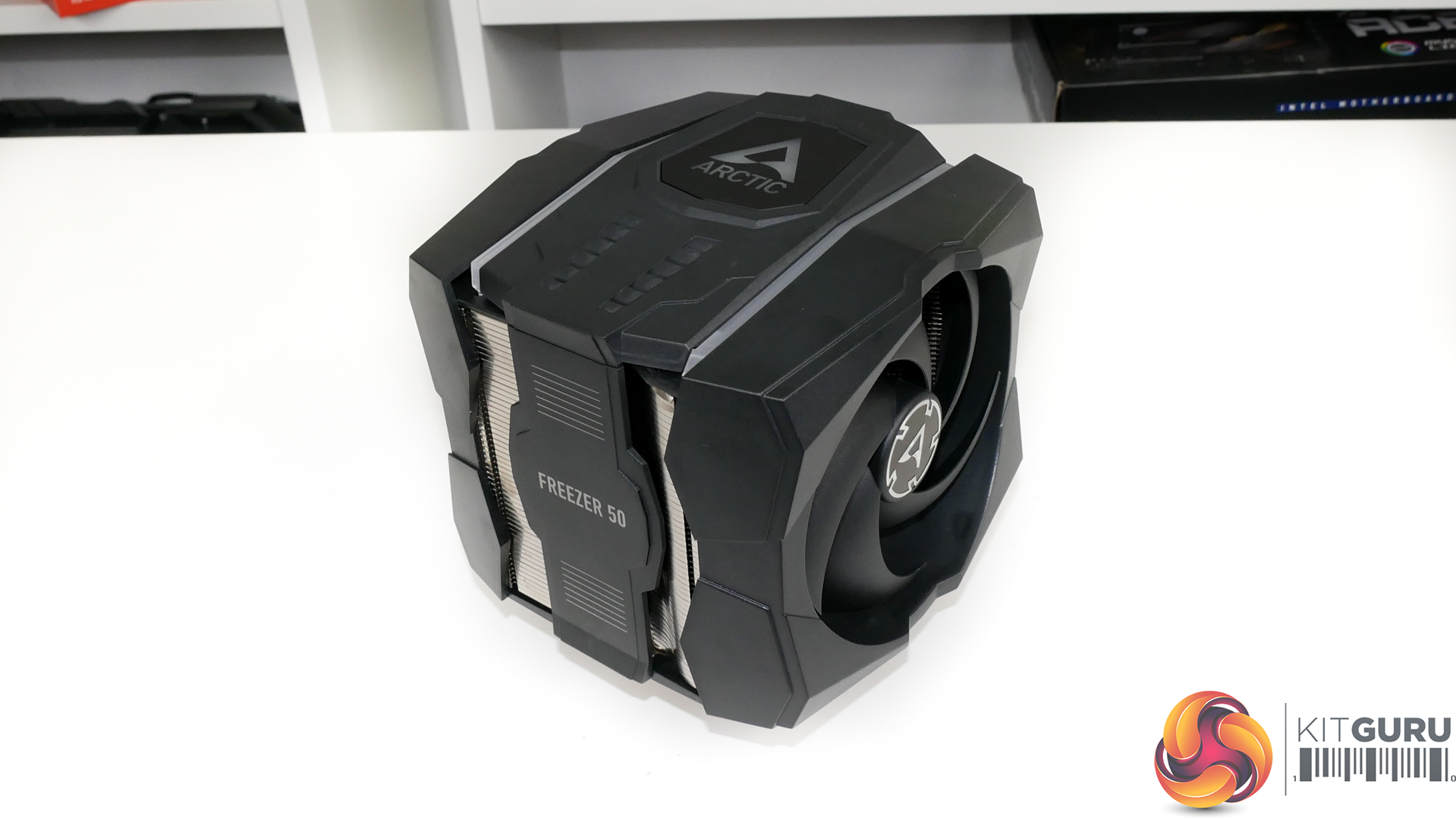 The Arctic Freezer 50 is a dual-tower, dual-fan air cooler that weighs in at a hefty 1.2kg and is priced around £60 in the UK. Much of the external body is covered by black plastic shrouds, including the two fans. The top shroud area houses the 13 A-RGB LEDs which includes the Arctic logo and the LED light bars.