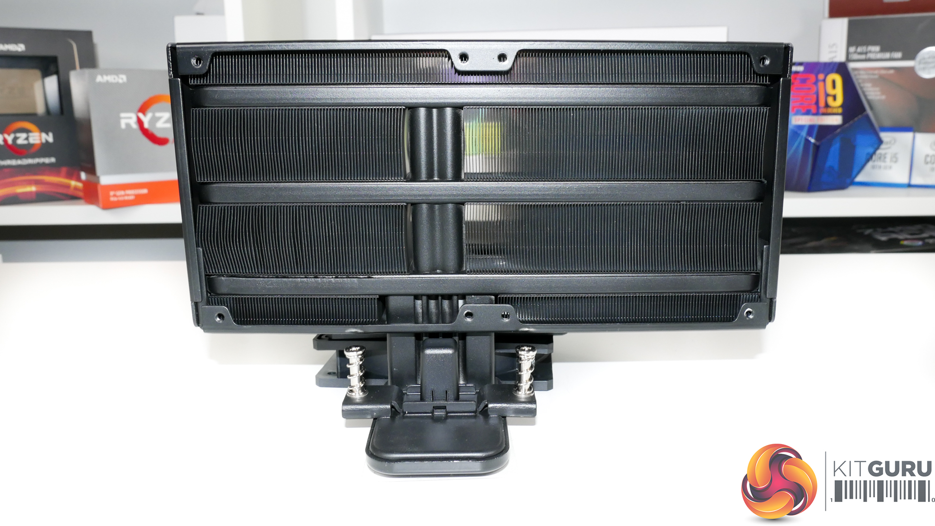 Four posts screw directly into the reference AMD backplate. This first step is easy whether the motherboard is on a table or whether it is installed inside the chassis. Two brackets then screw on top of the pillars and are tightened in position. The heatsink is mounted with both fans removed in order to access the spring-loaded retention screws. Both fans are then clipped onto the heatsink at the user-defined height level.