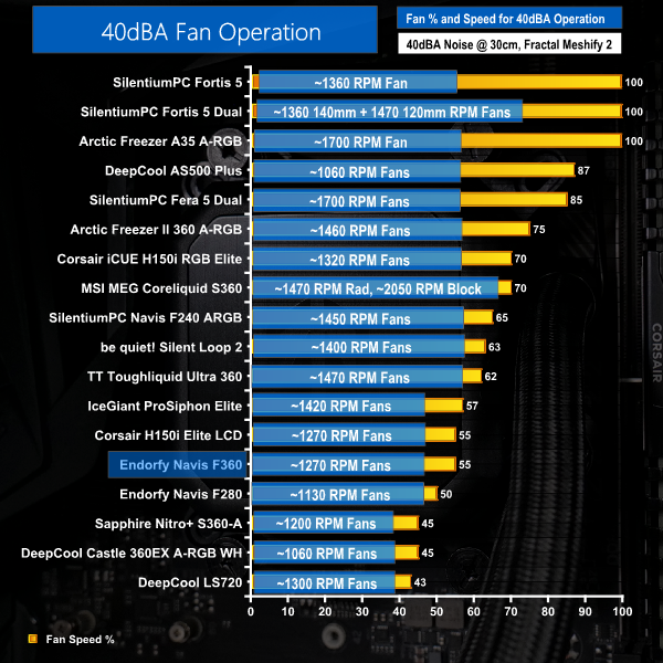 Noise performance at full fan speed is actually reasonably OK by 360mm AIO standards. We did have to shed quite a bit of fan speed to hit 40 dBA, but that’s not such a bad outcome because the performance is good and the fan curve headroom is retained.