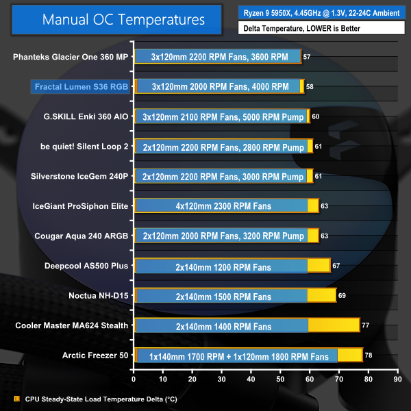 Fractal's new 360mm RGB model is able to outperform all other comparison products in our chart, except for the high-end (and expensive) Asetek-based Phanteks 360mm AIO. And the margin of difference there is very small.