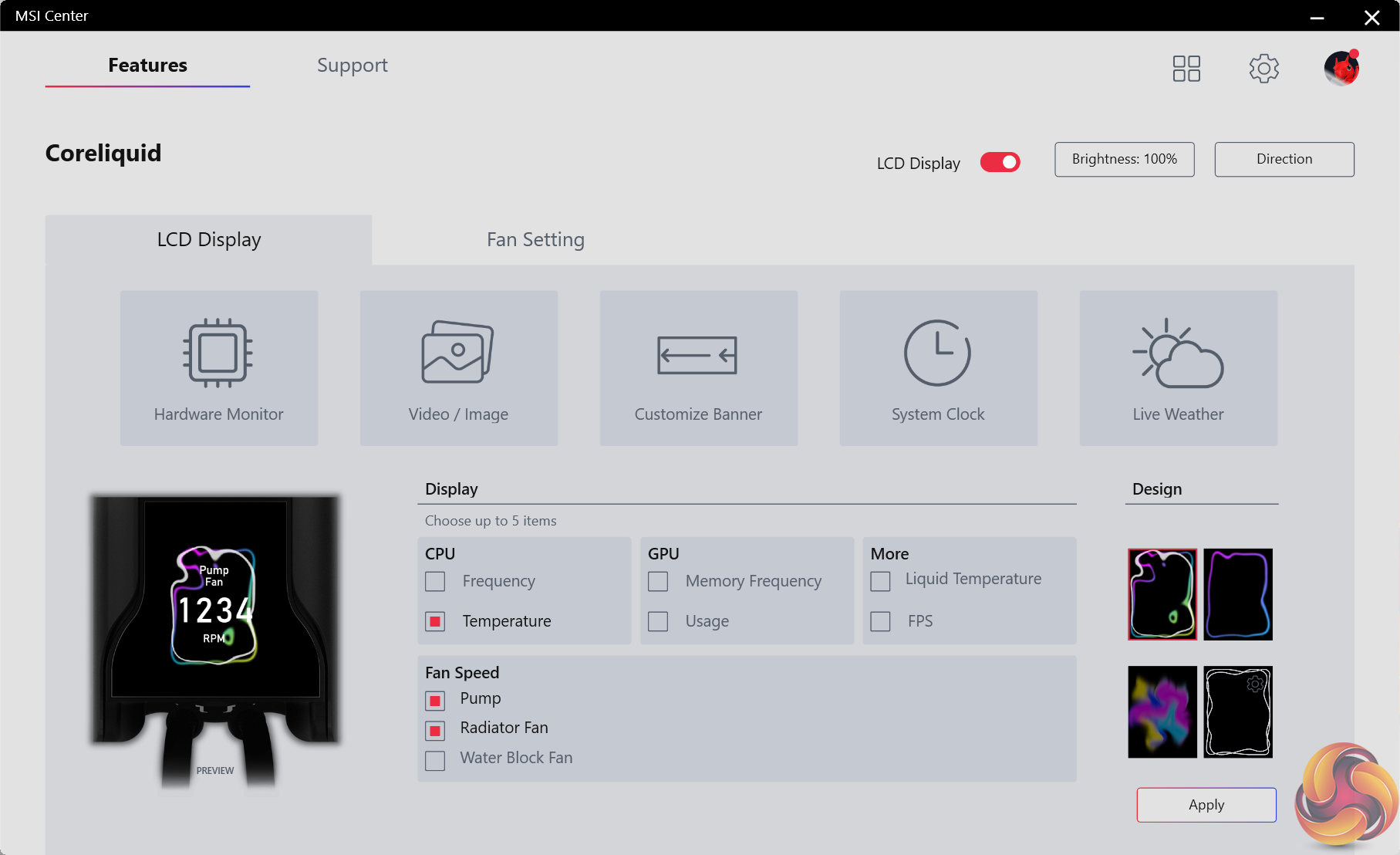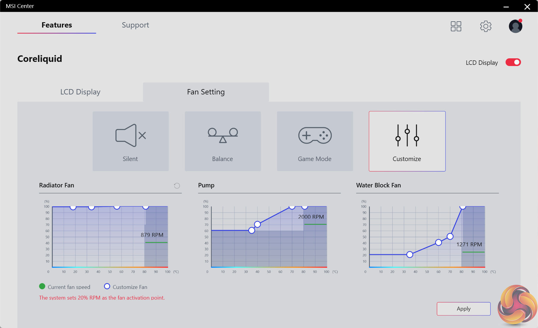The pump unit is PWM controlled and operates up to 2800 RPM top speed. Its speed curve can be controlled within MSI’s Windows software.