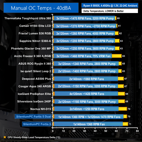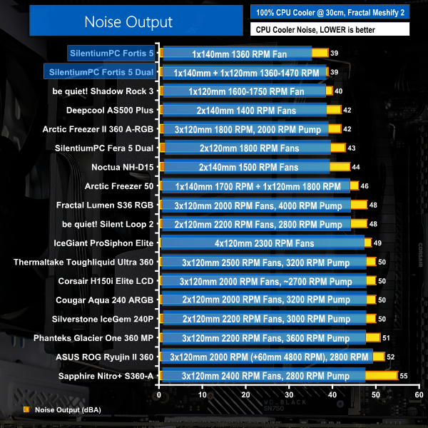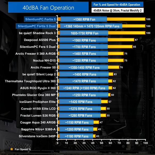 With 40dBA noise-locked performance, we do not see any change in the results from the Fortis 5 and Fortis 5 Dual as they were already below this level. However, the margins of performance deficit to some of the bigger and more expensive coolers are no squeezed.