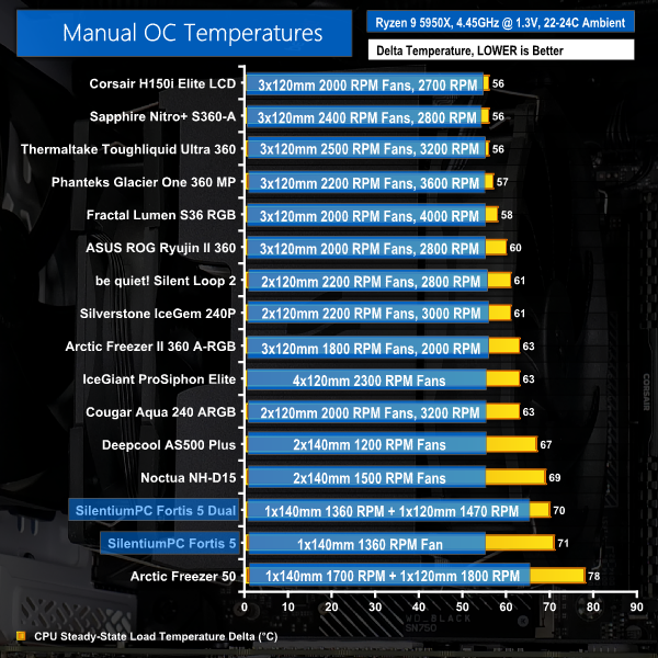 All coolers operate at full fan speed in this test, so the fact that SilentiumPC’s single-tower units are able to somewhat keep pace with the bigger dual-tower or dual-fan air coolers, as well as multi-fan AIOs, is impressive.