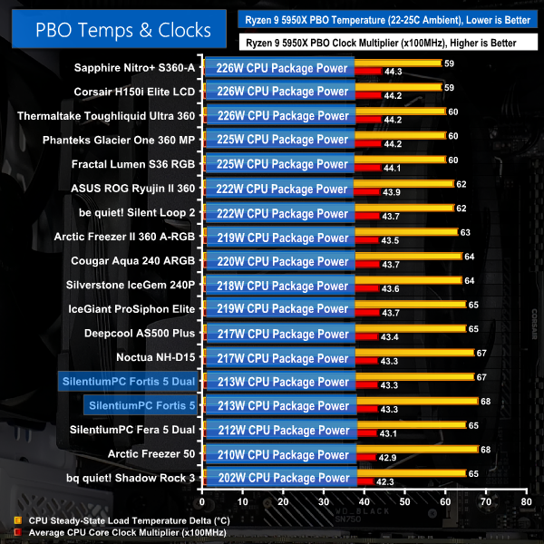 PBO shows a tangible gap in performance between the Fortis 5 and Fortis 5 Dual versus the likes of the Noctua NH-D15, even on our AM4 test platform.