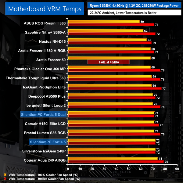 VRM cooling is absolutely fine at full fan speed. Though, the 40 dBA noise-locked performance comparison is particularly favourable towards SilentiumPC’s coolers.