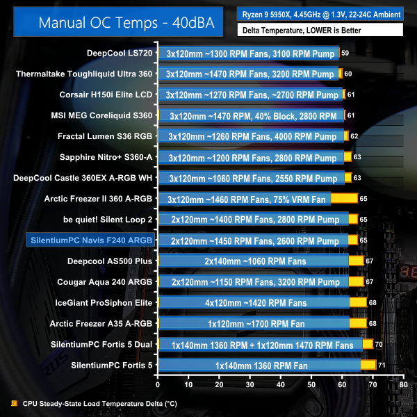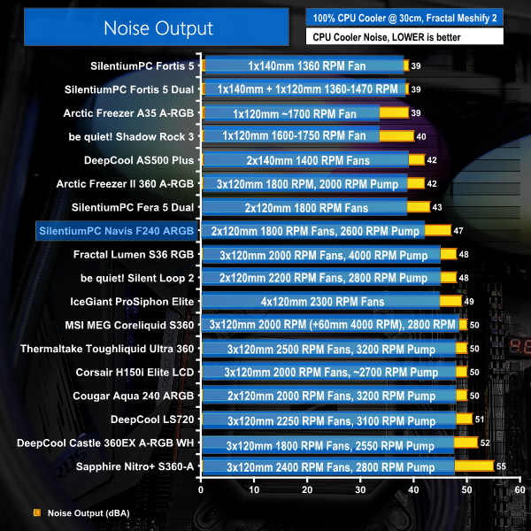 When locked at 40 dBA noise output, the SilentiumPC Navis F240 ARGB actually manages to very slightly improve its performance offering versus the be quiet! Silent Loop 2 240mm by matching its delta temperature. There’s clear headroom to the other 240mm AIO in our charts too – the Cougar Aqua 240 ARGB.