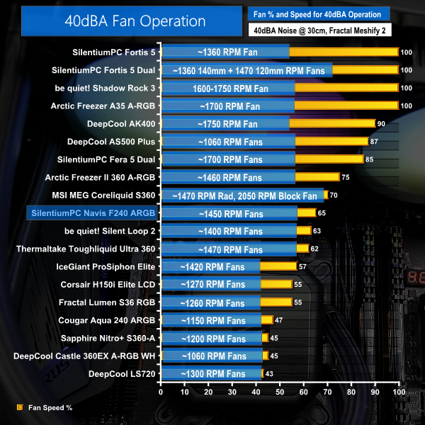 Cutting about a third off the fan speeds to hit 40 dBA noise output is actually quite reasonable. We aren’t choking the cooler too significantly in favour of noise, but we also have some capacity available if better temperatures are required.