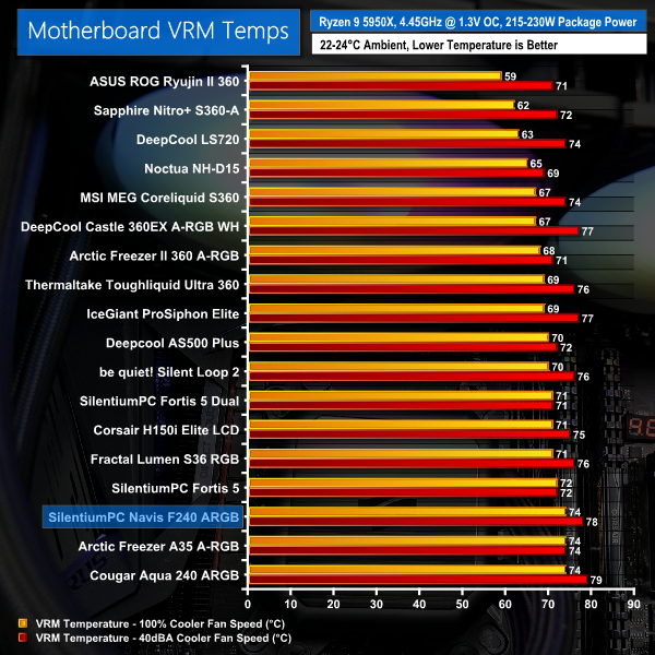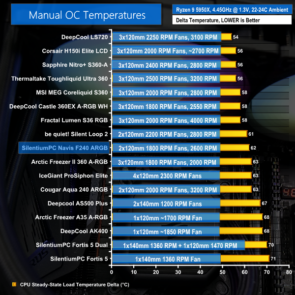 Full-speed performance cooling an overclocked Ryzen 9 5950X processor is strong from SilentiumPC. The 240mm Navis F240 ARGB is very marginally behind the more expensive 240mm be quiet! competitor. But SilentiumPC’s cooler manages to outperform the budget-friendly Cougar Aqua 240 ARGB by a slim margin.