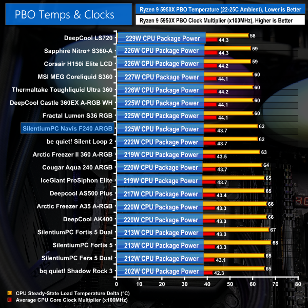 With the processor running in Precision Boost Overdrive mode, once again we see solid performance from the SilentiumPC Navis F240 ARGB cooler that has it matching the 240mm be quiet! Silent Loop 2.