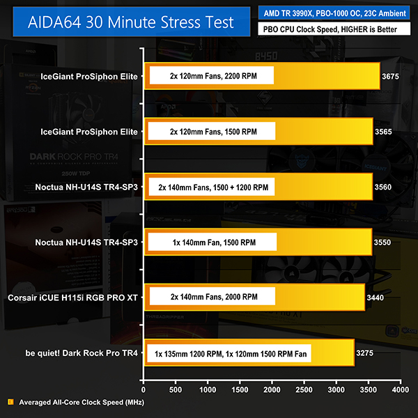 Unsurprisingly, the unit that handled the most power – IceGiant’s ProSiphon Elite in 2200 RPM fan speed form – delivered the greater averaged CPU clock frequency. Just shy of 3.7GHz on all 64 cores is a solid result, especially given that our test procedure runs the hardware inside a chassis and a slightly elevated ambient environment.