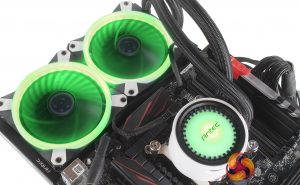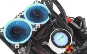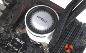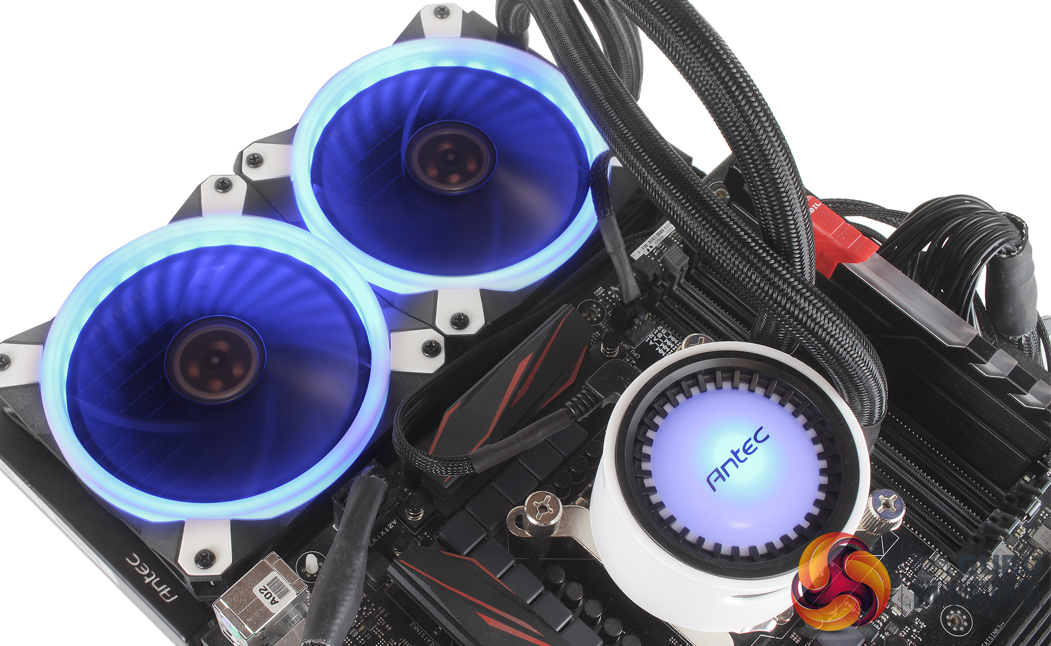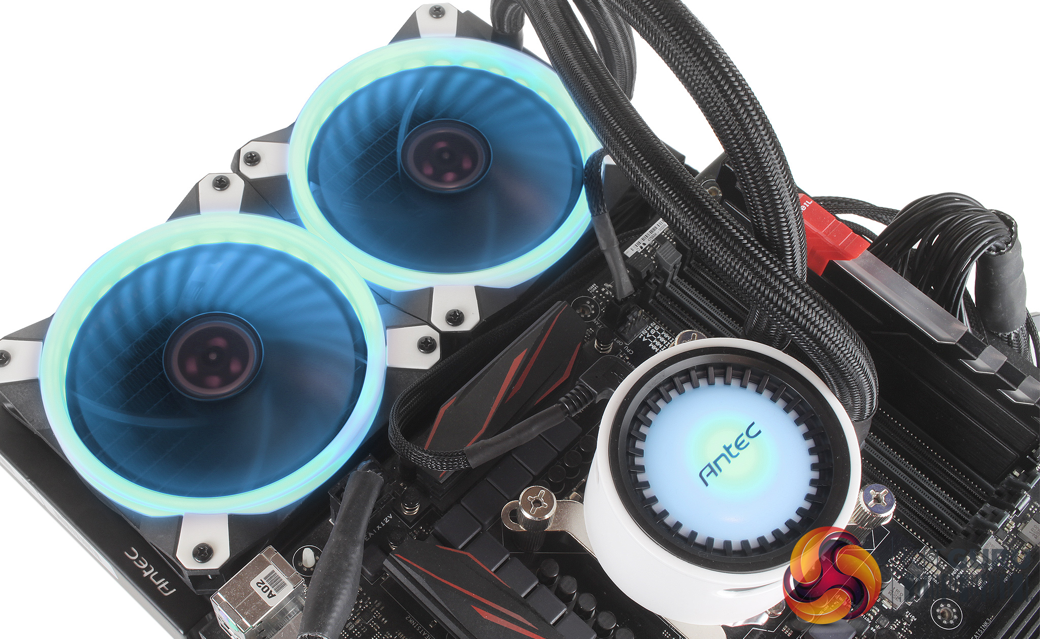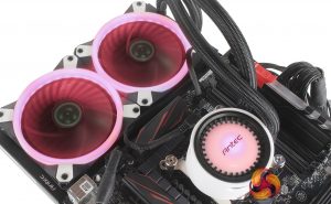 The RGB lighting covers enough of the bases, but is a little basic. With the included controller, you have access to modes like static, breathing, strobing and gradient colour cycling, which is just about enough to keep us happy. The lighting does look great on the ringed fans though, and the Antec logo on the top of the block also lights up. It’s not the brightest lighting but still shines through well in a darker room.