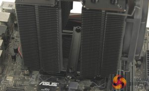 It's worth noting with the cooler installed that RAM clearance is a little limited. The front 120mm fan extended over 3 of the 4 available RAM slots on our test board, and with the front mounted at the very top of the cooler, there is only around 42mm of clearance for memory modules, only really suitable for low profile RAM.