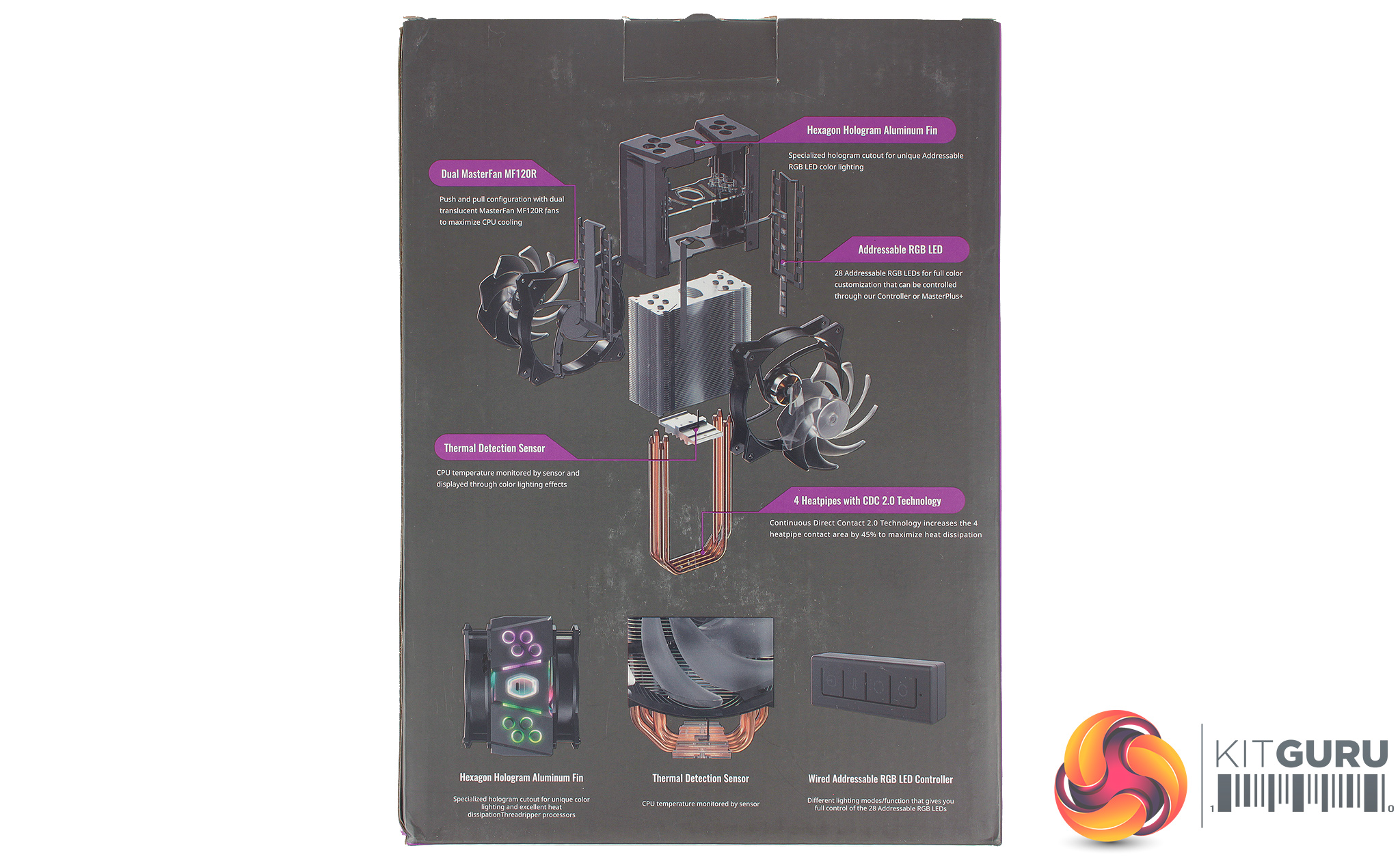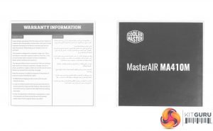The MA410M packaging follows a very similar aesthetic to other current Cooler Master coolers, sporting a lot of purple, and the newer Cooler Master logo. The front of the box provides a very clear image of the cooler in all its glory, while the rear show an exploded view of the coolers assembly, highlighting the various innovations applicable too this cooler. In the box, we find the cooler full assembled, alongside an accessory pack.