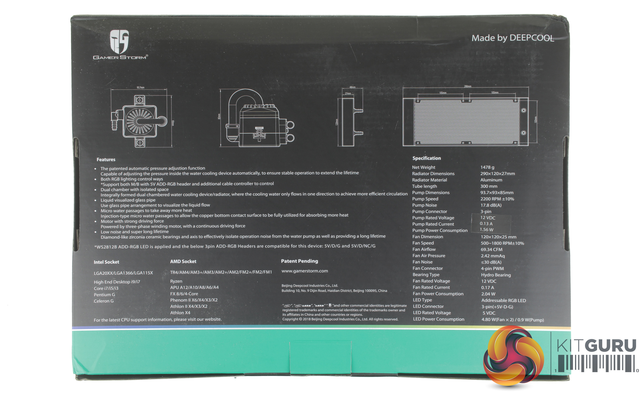 Taking a look at the cooler's box, it features a similar colour scheme to most Deepcool coolers. The front features a large image of the Captain 240 PRO and information on its addressable RGB lighting. The Captain 240 PRO is specified to work with ASUS Aura Sync, GIGABYTE RGB Fusion, MSI Mystic Light Sync, and ASRock Polychrome software.