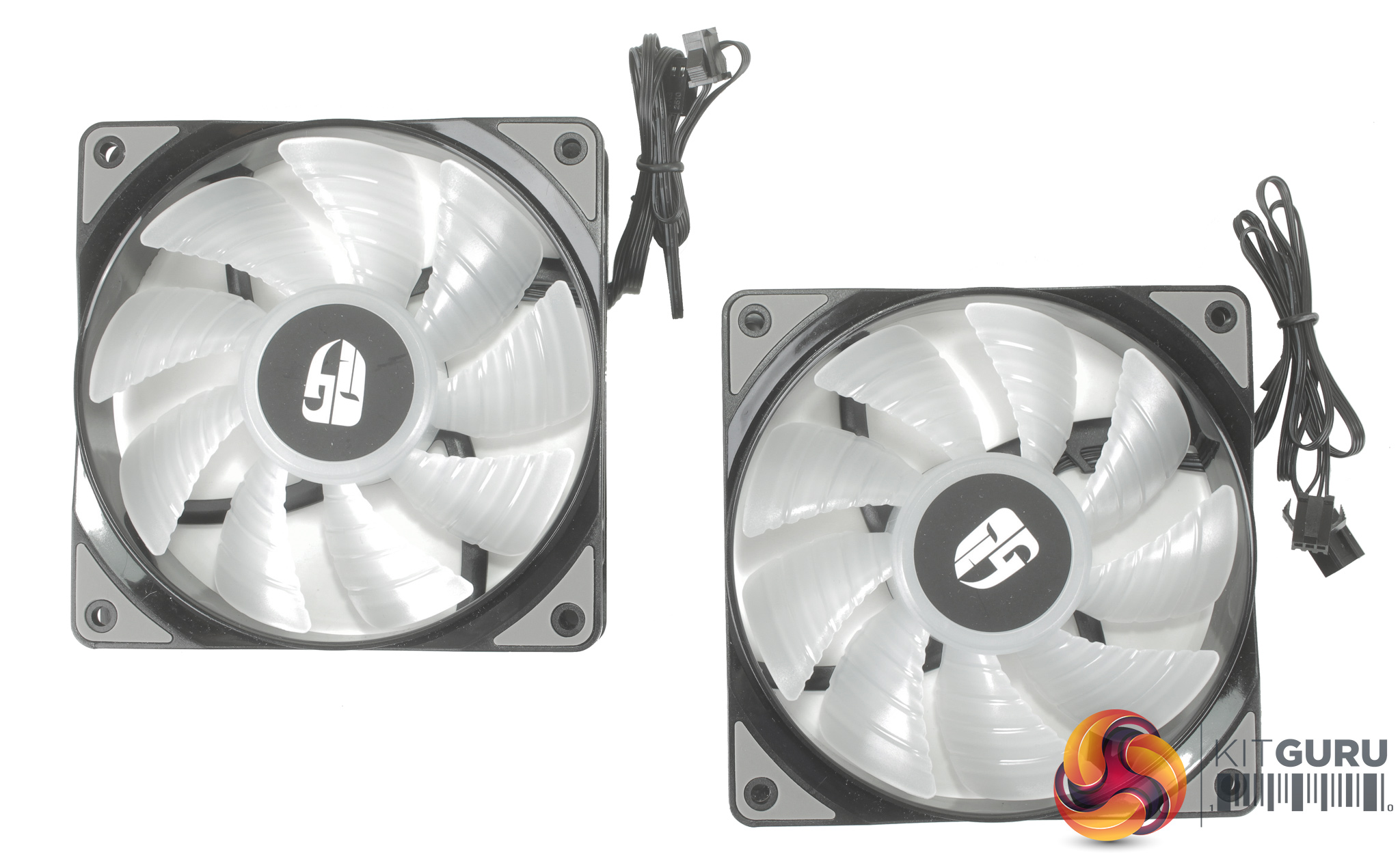 The included fans each feature 9 blades and rubber isolation pads in each corner. Connection-wise they use two separate cables – one 4-pin PWM, and a second proprietary 3-pin RGB LED cable. Looking at the cooler itself, the CPU block has quite a unique look and does still have some visual similarities to the Captain EX 240.