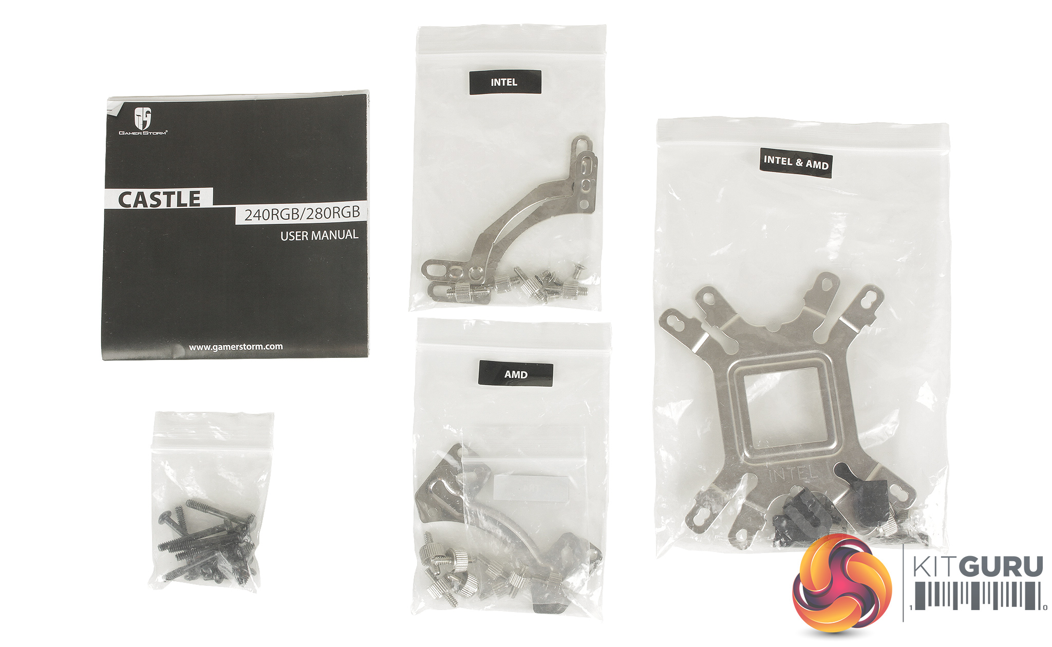 Installation instructions are included, as well as mounting hardware for current Intel and AMD sockets, as well as a number of older sockets.