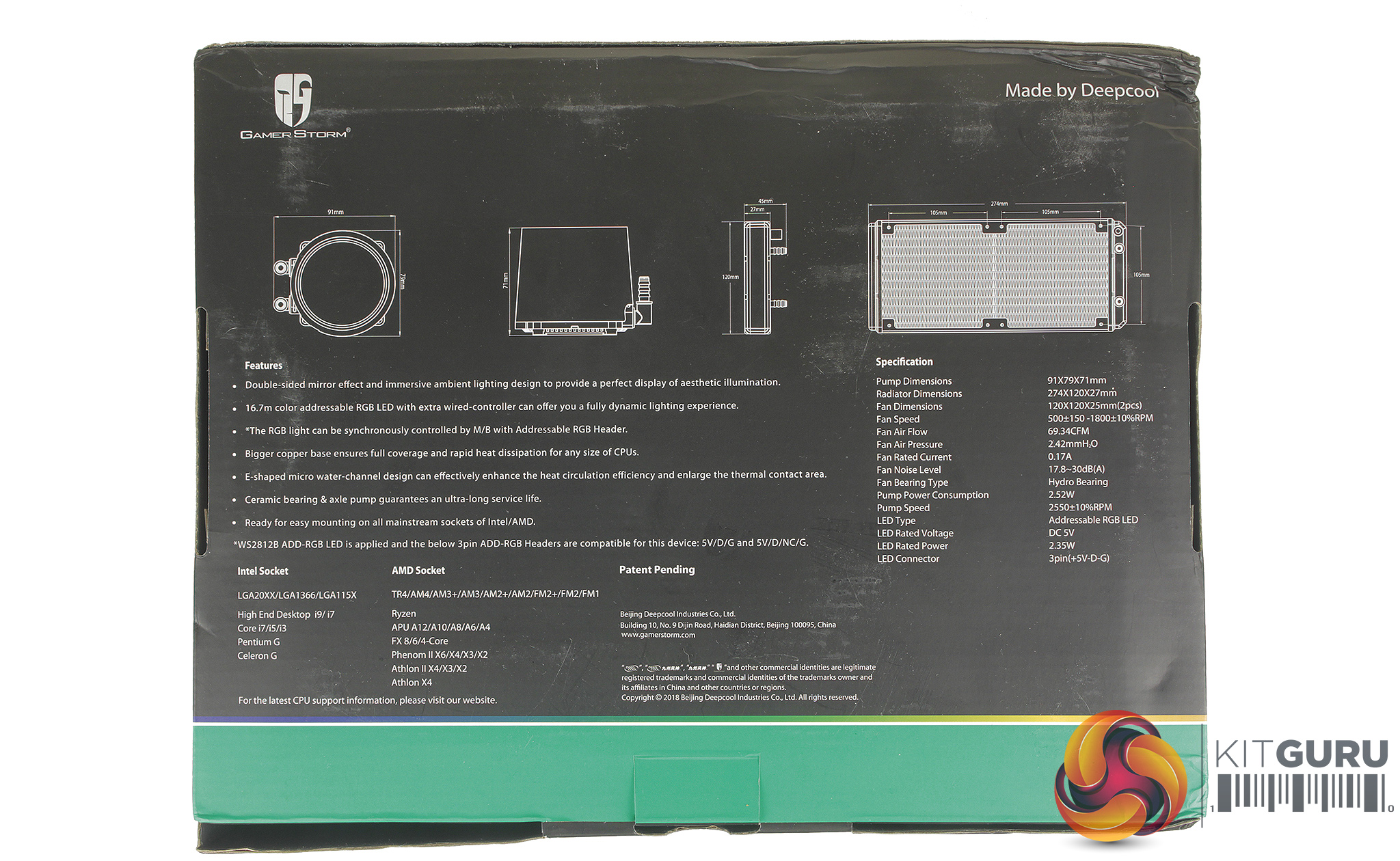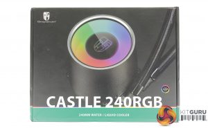 Packaging for the Castle 240 RGB shows off the quite large, but impressive looking CPU block on the front, and details of the dimensions of the cooler, included mounting options and connections on the rear. In the box, we find the cooler, an accessories box as well as two 120mm 4PIN PWM fans.