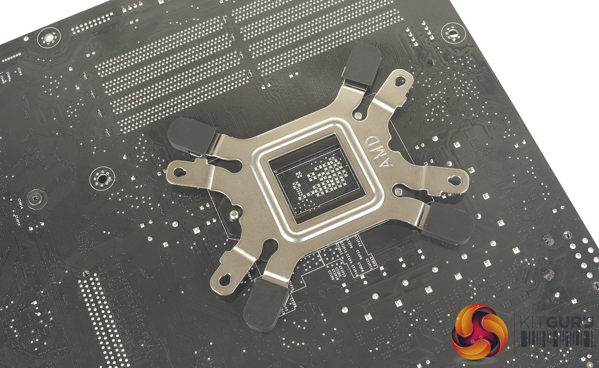 You use the longer included screws, which are set in place based on your socket, and then held to the backplate using four plastic clips. These are essential to prevent the metal of the backplate contacting the back of your motherboard. The backplate can then be fitted with the screws passing through the motherboard. It is worth noting that there are no additional standoffs to hold the backplate in place.