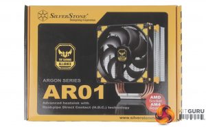 Taking a look at the box, it's clear SilverStone is really pushing the industrial design with black and yellow accenting throughout. The front of the box displays a clear picture of the cooler itself, as well as a TUF Gaming Alliance logo.
