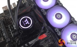 Taking a look at the cooler itself, there is a bit of bulk to the CPU block thanks to the addition of RGB lighting for the Thermaltake logo, but otherwise it looks like a familiar Asetek design. The radiator itself measures 394 x 120 x 27 mm and the tubing, although not braided, is a full 400mm long which is more than enough length to reach the front or top of your chosen case.