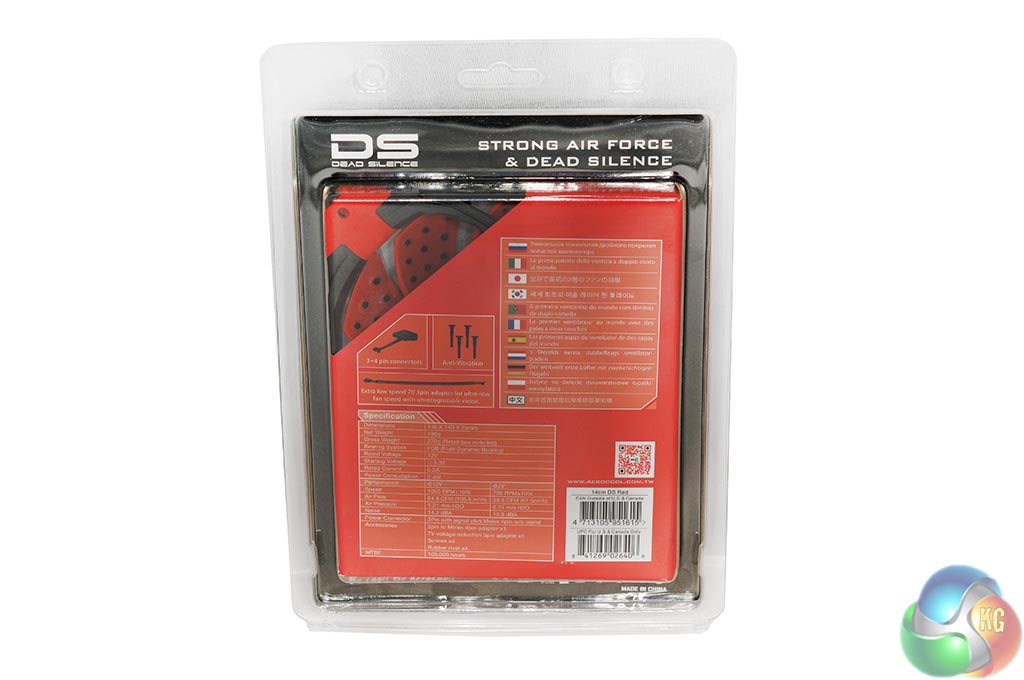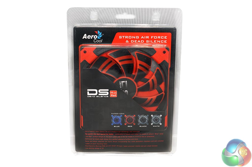 The 140mm (14cm) version of the Aerocool DS Dead Silence fan ships in a clear plastic packet with the product clearly visible from the front. This red coloured version looks great, and Aerocool highlight the other colours underneath the window.
