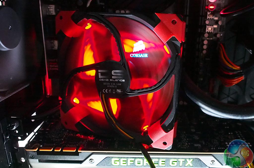 The Aerocool DS Dead Silence 140mm fan in operation, above. Each corner of the unit is lit up by a single Red, matching LED.