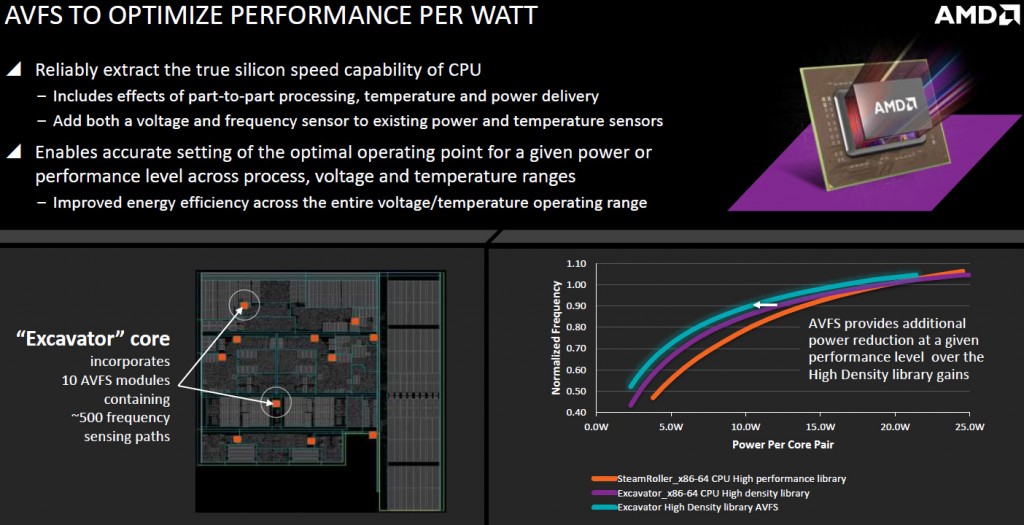 First of all, “Carrizo” incorporates voltage adaptive operation, or, adaptive voltage and frequency scaling (AVFS), which, when applied to both CPU and GPU in the APU results in 19 per cent and 10 per cent power savings respectively. AVFS modules (there are ten of such modules per “Excavator” core) monitor various aspects of chip’s condition (temperature, voltage, etc.) to adjust frequency and voltages in real-time. Essentially, AVFS reduces the typical operating voltage for a given frequency by adapting to per-part and environmental conditions, which reduces leakage and active switching power. While AVFS hardly brings a lot of benefits at high TDPs, the technology helps to reduce consumption at relatively limited thermal envelopes at given performance. In short, “Carrizo” will show its best at 15W – 20W. The chip itself is unable to work at extreme frequencies and AVFS will not provide advantages at 30W and beyond.