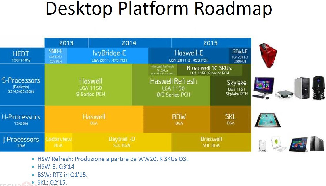 A desktop platform roadmap that Intel Corp. had reportedly demonstrated at a conference in Italy has been published by an unofficial source. A slide from the roadmap confirms that Intel intends to release both code-named “Broadwell” and “Skylake” microprocessors for desktops next year. In addition, the company intends to release its future high-end desktop chips code-named “Broadwell-E” in the second half of 2015.