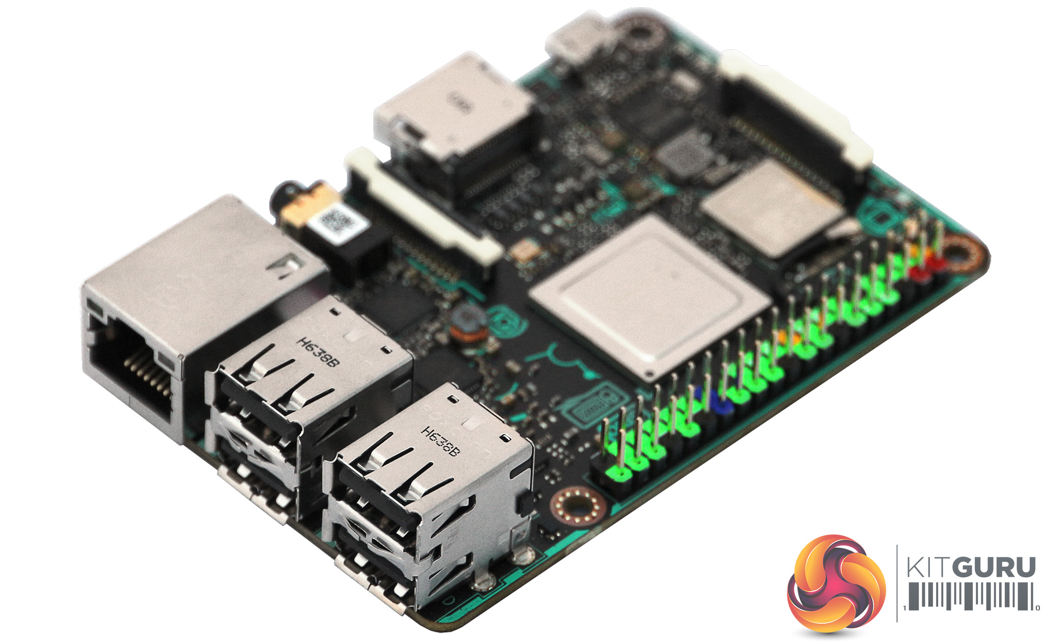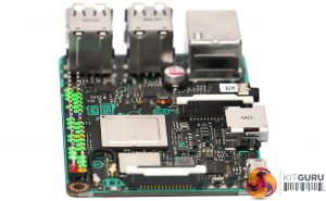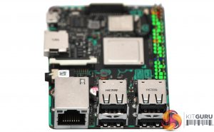 Just like a Raspberry Pi 3, one end sports the four USB 2.0 ports and LAN, although the latter in this case is Gigabit Ethernet. Nestling between the USB and LAN are bare connectors for S/PDIF digital audio, although you will have to solder your own wires to these. The other end is where the 15-pin DSI header for serial-connected displays resides.