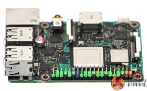 On the other longer edge there's the Micro USB connection for providing power, which should be 5V 2A. You need this much, too. We tried a USB port that didn't supply this much power and the Tinker Board wouldn't boot. Next along is full-sized HDMI connection with support for 4K screens at 60Hz, although this depends on operating system capabilities.
