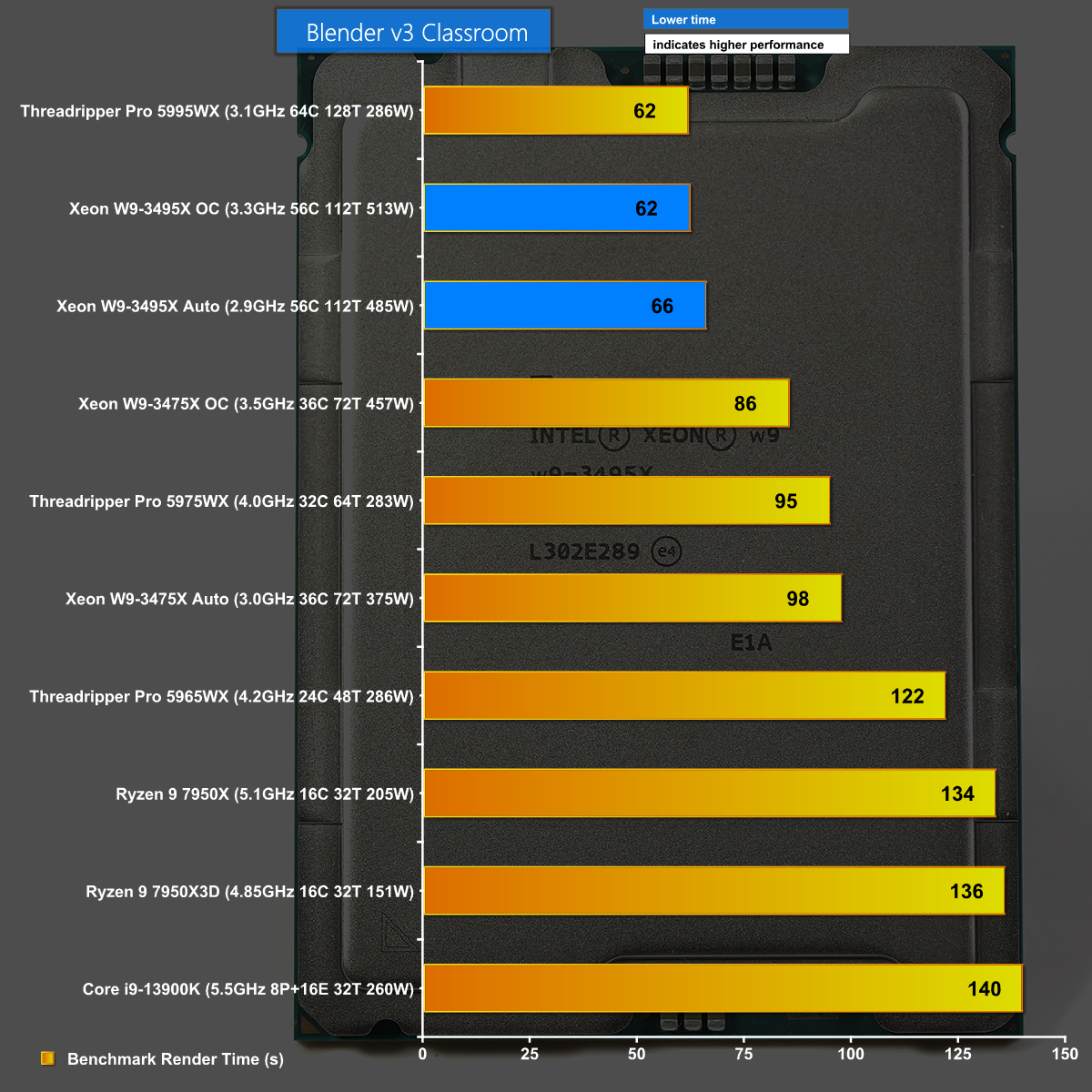 In Blender the might Threadripper Pro 5995WX equals the overclocked Xeon W9-3495X, showing the strength of those extra cores.